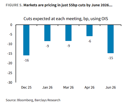 这意味着,在面前数据布景下,已毕性的货币计谋已无必要。巴克莱不雅察到,市集现在仅订价到2026年6月累计55个基点的降息,这种观念“过于一边倒”。