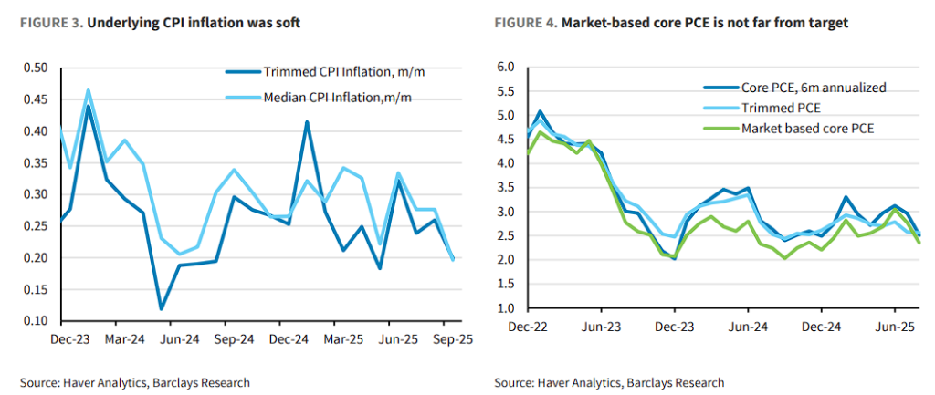 在通胀方面,鲍威尔也承认近期数据疲软。中枢通胀想法已泄漏下行趋势。巴克莱分析以为,一朝剔除关税影响,市集基础的中枢PCE通胀已接近2%的标的。